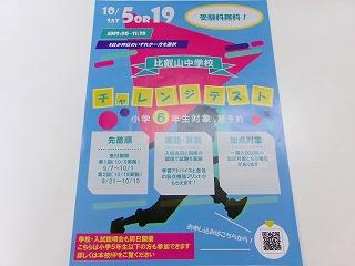 まだまだ夏ですか、というような天気の土曜日。 よく晴れて日差しも強く、ちょっと暑いですけど。 まあ、でも9月はこんな感じかな。 比叡山中学校「チャレンジテスト」 10/5(土) or 10/19(土), AM9:00〜11:30 小学6年生対象 要予約 先着順 受験料無料 国語・算数/入試当日と同様の環境で試験を実施 学習アドバイスと各自の弱点補強プリントがもらえます! 一隅入試出願の加点対象となる場合があります。 以上、比叡山中学校の受験を考えている小学6年生のみなさんへ、比叡山中学校からのお知らせです。 日程が2日あるのは、小学校の運動会の日と重なっている場合があるため。 どちらか一方を選択してください。 申し込みの受付が今日から始まっています。 比叡山中学校のホームページから。 このようなことで、いよいよ受験シーズン。 さあ、勉強の秋、進んでいきますよ。