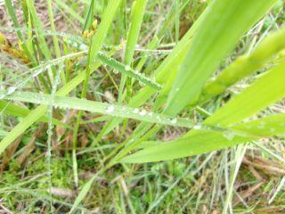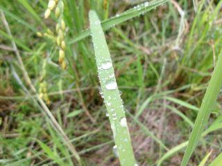 復活した稲穂と周りの葉にも雨粒の芸術。